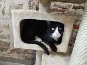 Taco is the unofficial mascot of Animedic. When she isn’t sleeping, Taco can be found greeting clients at the front desk, checking out cats in carriers, and eating “snacks” out of the trash. Her favorite spots to snooze are squished in her cat tree, draped on top of her cat house, and curled up in fresh laundry. Taco loves to talk and spends much of her day yelling at her team members. Taco’s favorite activities include watching the dogs in the waiting room from her perch on top of her house, drinking from the sink faucet, and acting as a foster mom to all of our adoptable kittens.